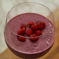 Combine strawberries, blackberries, some wild strawberries, almond flakes, and yogurt in a blender.