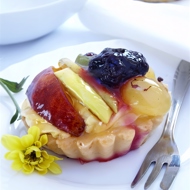 Remove the finished tartlets from the molds by inverting them, then fill them with berries — strawberries, raspberries, or grapes, and spoon hot jam over the top. The tartlets can be garnished with chopped nuts or lightly toasted almonds.
