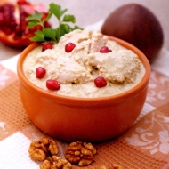 Dilute the resulting walnut mixture with hot broth to the consistency of thick sour cream. Immediately pour this sauce over the chicken pieces.