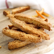 Carefully transfer the warm baked goods to a cutting board and slice them thinly on the diagonal with a sharp knife. Arrange them in a single layer on a parchment-lined baking sheet and return to the oven for about 30–45 minutes until crispy. Cool on the baking sheet for about 15 minutes. Repeat the same process with the remaining biscotti.