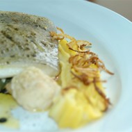 Marinate two portioned pieces of fish with pink pepper, sage, and white Riesling, using olive oil, making cuts on the fish skin side beforehand. Place the fish in a steamer for 7 minutes.