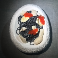 The pasta should be al dente. Gently mix everything so that the pasta absorbs the sauce, and serve it on a plate. Top with a bit of caviar. The most important thing is not to overcook the squid, so it remains tender and juicy.