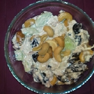 Add the chicken to the chopped prunes cut into quarters, peeled and chopped cucumbers (2 small or 1 large), roasted cashews (more to taste), and mayonnaise. Mix everything together. Add salt to taste. Dress with mayonnaise.