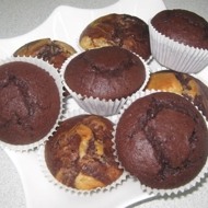 To prepare the batter, mix the classic and chocolate muffin mixes separately with milk, vegetable oil, and eggs, and knead until smooth according to the instructions on the packages. Place 24 paper liners on a baking sheet.