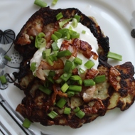 Place the bocsti on a plate. Top with sour cream, bacon, and green onion. Ready.