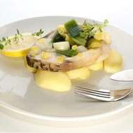 Before serving, cut the fish into pieces, place it on a plate, garnish with boiled potatoes dressed with oil, and sprinkle with finely chopped parsley. Serve horseradish with vinegar separately.