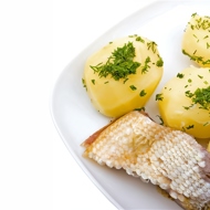 Cut the prepared fish (such as pike perch, pike, catfish, tench, etc.) into pieces and boil. Separately, boil the peeled whole potatoes.