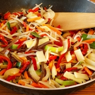 Add the bok choy, stir-fry, then add 2 tablespoons of water. Reduce the heat and simmer for 2–3 minutes.
