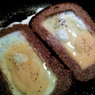 Cut out the centers of the bread slices and place them in a hot skillet.