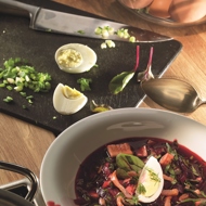 Once on the plate, season with sour cream and—if there is an aesthetic or physiological need—add half or a quarter of a boiled egg to each plate. However, this means you will need to boil not six, as stated in this recipe, but ten or even more, depending on your appetite.