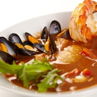 Strain the contents of the pot through a sieve, return the mixture to the pot, and add 1 tablespoon of oil. Quickly bring the soup to a boil. Add the fish and seafood. Remove from heat, season with salt and pepper, and cover.