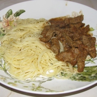 Cut the beef into strips, add a small amount of water (meat/water ratio is approximately 3:2), season with salt and pepper, and optionally add spices to taste. Simmer on low heat in a skillet (covered) for about 1.5 hours.