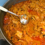 Chop and sauté the onion. Mix it with tomato puree, vinegar, sugar, salt, bay leaf, and pepper. Add the resulting mixture to the pot and continue to simmer until cooked through — about 10 minutes.