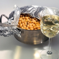 Combine the cooked chickpeas with extra virgin olive oil and freshly ground black pepper. Serve with chilled dry white wine.