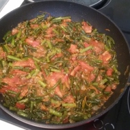 When the tomatoes release their juice, add the garlic scapes to the skillet. When the scapes change color and become tender, turn off the heat.