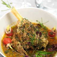 Remove the cooked shank. Strain the sauce and let it simmer on low heat for ten to fifteen minutes until it reaches the desired thickness. Warm the shank in the sauce, basting it, and add finely chopped garlic (clove), one sprig each of thyme and rosemary, then season with salt and pepper.