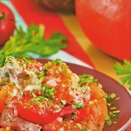 After 10–15 minutes, add finely chopped, sautéed onion, salt, pepper, place the sautéed pumpkin slices and halved tomatoes on top of the meat.