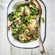 Braised Romaine Lettuce with Smoked Bacon and Green Peas