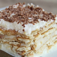 Pour a little of the mixture into the baking dish, spreading it evenly across the bottom. Layer one layer of 'Maria' cookies (or 'Ladyfingers') on top of the cream. Add a layer of sliced fruits (such as strawberries and bananas) over the cookies before adding more of the mixture. Then add another layer of cream on top and repeat with another layer of cookies and another layer of fruit (if desired).