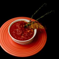 Break the garlic baguette into small pieces, add to the pot, and stir. Add salt and pepper to taste, as well as the basil leaves.