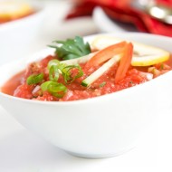 Dice one cucumber and one tomato and add to the soup. Sprinkle with chopped herbs.