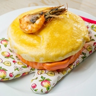 Place an oven mitt on a serving plate, set the dish with the pie on top, make a hole in the center of the pastry, and insert the shrimp.