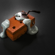 For the velour, melt the cocoa butter and chocolate separately, then mix them together. Place the sliced sponge cake into molds, layer with chocolate mousse, and then praline mousse. Cover with the velour. Serve with banana sauce.