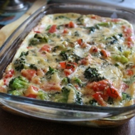 By this time, the broccoli should have cooled. Place it in a greased baking dish, slice the tomato, and add it as well.