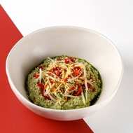 Transfer the prepared hummus to a plate and create a small indentation in the center. Place the zucchini in the indentation. Drizzle basil oil around the edges of the hummus, and sprinkle the dish with sesame seeds, roasted chili with peanuts, and lime zest.