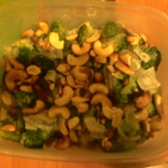 Split the cashews in half. Peel the onion and slice it into half-moons, then wash the broccoli and cut it into florets.