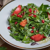 Transfer to a large dish, sprinkle with pomegranate seeds, season with Svan salt, and drizzle with narsharab sauce.