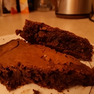 Whisk the eggs. While whisking, add the brown sugar and continue to whisk until the mixture is thick and homogeneous. Fold in the slightly cooled chocolate-butter mixture and mix well.