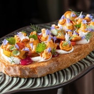 Another creation by John Smith, resembling an edible painting. Bruschetta with chanterelles is perhaps the most popular restaurant genre, but in this interpretation, it looks fresh and new. The chanterelles are sautéed in hot oil until lightly golden and carefully arranged on super crispy bread (which is dried twice — first on the grill, then in the oven) and a layer of creamy cheese. The white serves as a perfect backdrop for the golden, and the splashes of lingonberry sauce peeking through here and there transform the bruschetta's landscape into a feast for the eyes.