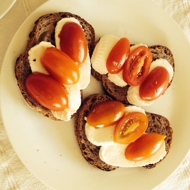 On the pieces of baguette, slightly soaked in olive oil, place the mozzarella on top, then the cherry slices, and if desired, add a pinch of salt, and there you have it, a delicious bruschetta with mozzarella and cherry tomatoes ready.