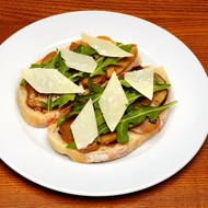 Top the bread with mushrooms, a few leaves of arugula, and finish with very thin slices of parmesan.