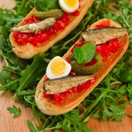 Top the bruschetta with sprats, halved cornichons, and quail eggs.