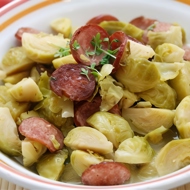 Place the Brussels sprouts in salted water and boil for 15 minutes, covered. Cut the sausages into small pieces. Drain the broth, measuring out 1/4 of it.