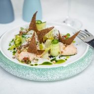 From 110 grams of hummus, shape three dumplings. Place them on a plate. Next to them, add 30 grams of sun-dried tomato salsa. Slice cucumbers and celery into thin wedges, drizzle with olive oil, and sprinkle with salt. Roll the cucumber and celery slices into tubes and place them in the space between the hummus. Top with grated suluguni cheese. Insert chips made from Borodinsky bread into the hummus dumplings in a random arrangement, then sprinkle with 40 grams of buckwheat popcorn and olive powder, and drizzle with green oil. Garnish with lemon zest and microgreens.
