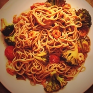 Buckwheat Noodles with Shrimp, Broccoli, and Cherry Tomatoes
