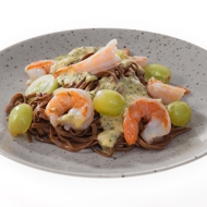 Buckwheat noodles with shrimp, grapes, and green aioli sauce.
