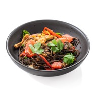 Buckwheat noodles with turkey and peanuts in Asian style.