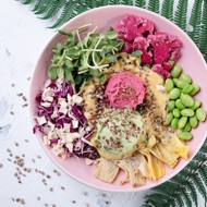Pour the mango sauce into the center of the bowl, using an ice cream scoop to place the hummus in the center. Sprinkle the hummus with hemp seeds, and add the red cabbage alongside parsnips.