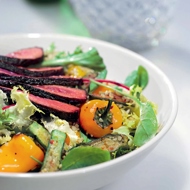 In a large bowl, combine the bulgur with the salad leaves and sautéed vegetables, then dress with olive oil. Top with thinly sliced meat.
