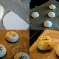 Make indentations in the risen balls (you can use the handle of a spoon or just your finger) and fill them: finely chopped garlic at the bottom, then cheese, and sprinkle with spices (dried basil or herbs de Provence work well here).