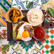 Assemble the burger. Spread mustard sauce on the bottom half of the bun. On the sauce, place iceberg lettuce, followed by coleslaw, then cucumber, the patty with cheese, tomato, onion, fried egg, crispy bacon, and the top bun with sauce. Serve with French fries and ketchup.