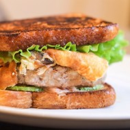 Burger on toasted bread with zucchini, mushroom omelet, and homemade mayonnaise dressing