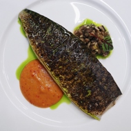 Before serving, heat the mackerel fillets to 140°F and char with a torch. Arrange the fish on a plate, add a tablespoon of pepper sauce, and a spoonful of mushroom tartare. Garnish with microgreens.