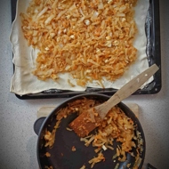 I used ready-made, yeast-free dough! Roll out both sheets, and place one on a baking tray, previously dusting the bottom with a thin layer of wheat flour—this will be the bottom layer of the pie, while the second should be set aside carefully in its rolled-out state.