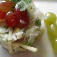 Shred the tart-sweet apples into thin strips, mix with lemon juice, and add to the salad.