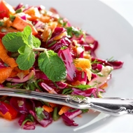 Cut the cabbage, onion, broccoli, cauliflower, pepper, and carrot into uneven pieces.